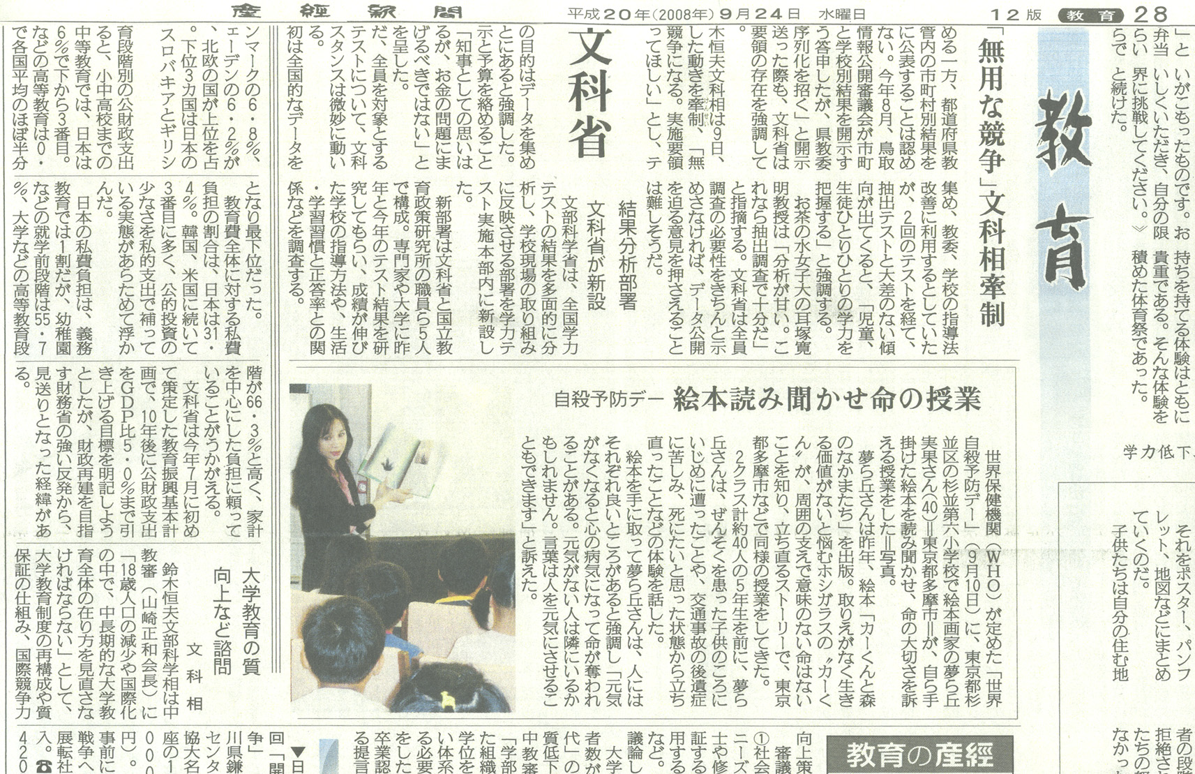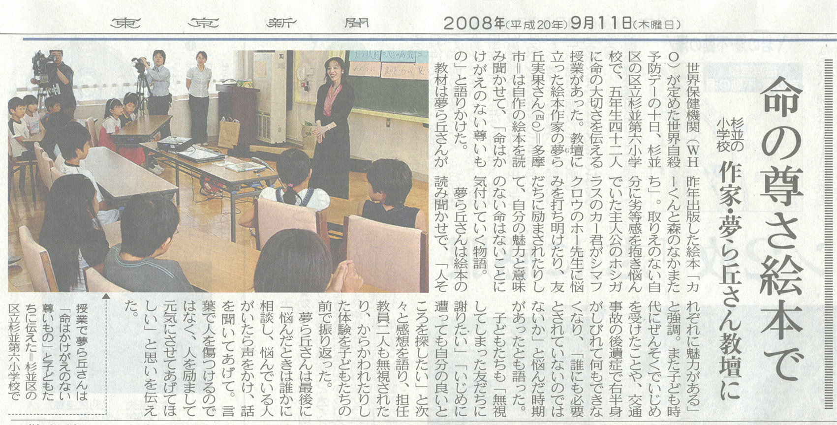 都内の中学校にて心を守るための授業をいたしました。一生涯のうちに精神疾患に罹る割合は90%近くにもなるというデューク大学のカスピ博士の調査や心の病気の予防や対処の方法等を学びました。(時事通信社『内外教育』12/1号) 日本一人口が少ない青ヶ島村や八丈島等に出張して『命の授業』をさせていただきました。就航率が低く「神のご加護がないと行けない島」と言われていた青ヶ島に予定通り辿り着き、子ども達と交流することが出来ました。(七島新聞) 娘が中学生の時から18年間取り組んできたうつ・自殺予防となる心の健康のための「命の授業」は、新宿の小学校での授業にて1000回を超え、気を引き締めております。ご一緒に絵本を作った日野原重明医師のご遺志を引き継ぎ、活動を続けてまいりたいと思っております。(日経社会面 Answers) コロナの影響もあり心を病む子ども達が増えています。笑顔でも悩みを抱え込んでいるケースもあります。子どもへの接し方や「心の教育」の重要性についてお話しさせていただきました。(産経社会面、 時事通信社『内外教育』1/10号) 夏休み明けは心を病む子ども達が増える傾向があります。コロナ禍で不登校も増加しています。埼玉県の中学校にて読み聞かせによる心の健康のための授業を行いました。日本テレビ『news every.』にて紹介されました。(産経社会面) 長崎県佐世保市の子ども達にジャパネットたかた創業者の高田 明様とご一緒に『命の授業』を行いました。(西日本新聞、長崎新聞、毎日新聞)その後、兵庫県芦屋市にて自尊感情を向上させるための心の健康のための授業、東京都多摩市の中学校にてコロナ禍のストレスに対処する授業を行いました。(MBS特集ニュース、NHKニュースで紹介されました) 埼玉志木市と東京町田市の学校にて東日本大震災の被災地に思いを馳せ、かけがえのない命と故郷の大切さを考える授業を行いました。授業の様子はテレビ埼玉等にて紹介されました。(毎日新聞「ひと」、読売新聞、東京新聞、埼玉新聞) 東京町田市と大阪門真市の小中学校にて『カーくんと森のなかまたち』を活用した心の健康のための教育(自尊感情を高め、SOSの出し方等を学ぶ教育)を行いました。授業はNHK、FNNニュース等にて放映されました。(読売新聞) 和歌山の加太中学校で実施した「命の授業」がABCニュース等にて紹介されました。(朝日新聞)(毎日新聞)(産経新聞) 永田町の麹町中学校にて、絵本『カーくんと森のなかまたち』を活用し、オンラインによる心の健康のための道徳授業を行いました。授業はご自宅の保護者の方々にも配信され、皆様に心を健康にする方法を学んでいただきました。(毎日新聞) 3月17日朝日新聞教育面に、児童養護施設等での心の健康のための『カーくんと森のなかまたち』読み聞かせについて掲載されました。(朝日新聞教育面「絵本作家、読み聞かせ700回 SOS出してほしいから 誰かに頼ること=自立すること」) 長アの学校と児童養護施設の子ども達に、ジャパネットたかた創業者の高田明様とご一緒に「命の授業」をさせていただきました。(長崎新聞、西日本新聞、毎日新聞)その後、山口県にて授業を行いました。(山口新聞、中国新聞) 読み聞かせの授業が700回を超えました。今後も心の健康のための『命の教育』に微力を尽くしてまいります。和歌山、高知にて行った授業が、新聞、ラジオ等で紹介されました。(読売新聞、毎日新聞、高知新聞、和歌山新報、和歌山放送) 福岡の学校と児童養護施設にて『カーくんと森のなかまたち』読み聞かせによる「命の授業」を行いました。テレビ東京系のニュース特集等で放映されました。(毎日新聞教育面『教育の窓』、西日本新聞、朝日新聞、九州朝日放送) 新潟県の学校4校と児童養護施設にて『カーくんと森のなかまたち』を活用した心の健康のための授業を行いました。(新潟県教委「子どもの命を守る支援者ネットワーク事業」)(読売新聞、新潟日報、朝日新聞、毎日新聞、TV新潟) 高知大学教育学部付属小学校をはじめ高知県内の学校と児童養護施設にて絵本読み聞かせによる命の大切さを考える授業を行いました。授業の様子は、テレビ高知、高知放送にて放映されました。(高知新聞、読売新聞、朝日新聞) 香川県の心の健康づくり事業として、香川県の小中学校6校にて『カーくんと森のなかまたち』読み聞かせの授業を行いました。西日本放送、瀬戸内海放送等のTVニュースにて紹介されました。(NHKニュース動画)(四国新聞、朝日新聞) 品川区の小学校にて文科省児童生徒課とご一緒に『カーくんと森のなかまたち』を活用した心の健康のための授業を行いました。NHK『首都圏ネットワーク』『NHKジャーナル』(NHKラジオ第1放送全国版)にて放送されました。 北海道の小学校にて『カーくんと森のなかまたち』読み聞かせの授業を行いました。(釧路新聞、北海道新聞) 神奈川県の人権教育研究校まなづる小学校の人権フォーラム(道徳授業地区公開講座)にて心の健康のための授業